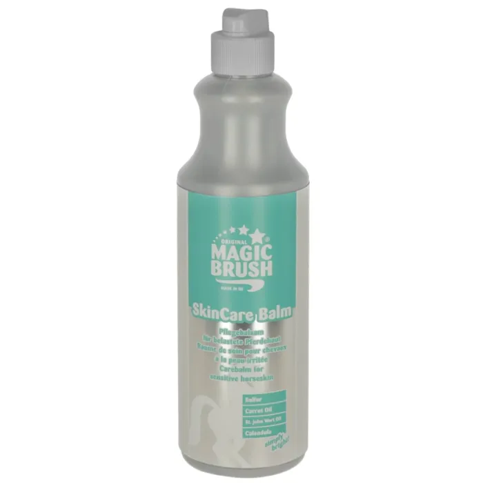 Balsam do pielęgnacji skóry Magic Brush SkinCare Balm to skuteczny kosmetyk przeznaczony dla koni, którego celem jest łagodzenie podrażnień oraz ochrona skóry przed czynnikami środowiskowymi. Dzięki specjalnej, szybko wchłaniającej się formule składniki aktywne docierają bezpośrednio do głębszych warstw skóry, zapewniając intensywną regenerację. Zawarte w produkcie naturalne ekstrakty z nagietka, marchwi i dziurawca wzmacniają odporność skóry i sierści, jednocześnie przyspieszając procesy regeneracyjne. Płynna siarka pomaga zmniejszyć swędzenie i ogranicza skłonność konia do ocierania się. Balsam dla konia ma nietłustą konsystencję, dzięki czemu jest wygodny w aplikacji i nie pozostawia śladów na sierści. To doskonały wybór dla właścicieli, którzy szukają naturalnego i skutecznego wsparcia w codziennej pielęgnacji konia.