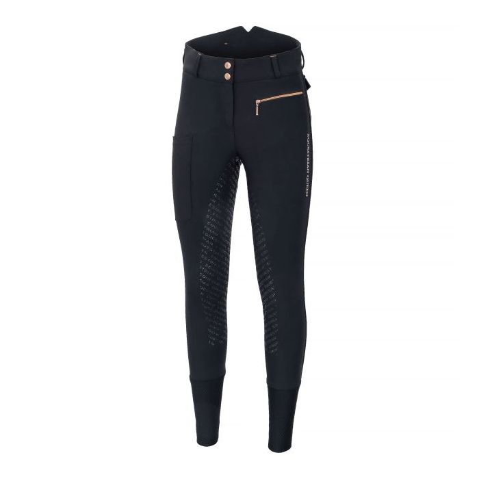 Bryczesy damskie Equestrian Queen Tameside 24SS to model stworzony z myślą o cieplejszych miesiącach. Wykonane z cienkiego, oddychającego materiału z dodatkiem Kool-X, zapewniają uczucie chłodzenia i komfort termiczny nawet w upalne dni. Wysoki stan i starannie zaprojektowany krój świetnie modelują sylwetkę i maskują drobne niedoskonałości. Pełny lej silikonowy z drobinkami brokatu gwarantuje przyczepność do siodła i subtelny efekt wizualny. Model wyposażono w cztery praktyczne kieszenie, w tym jedną na telefon i jedną zapinaną na suwak. Dodatkową wygodę zapewniają nogawki wykończone elastyczną wstawką BREATHLITE, która ułatwia zakładanie bryczesów i poprawia wentylację. To spodnie do jazdy konnej, które łączą funkcjonalność, nowoczesny styl i letnią lekkość.
