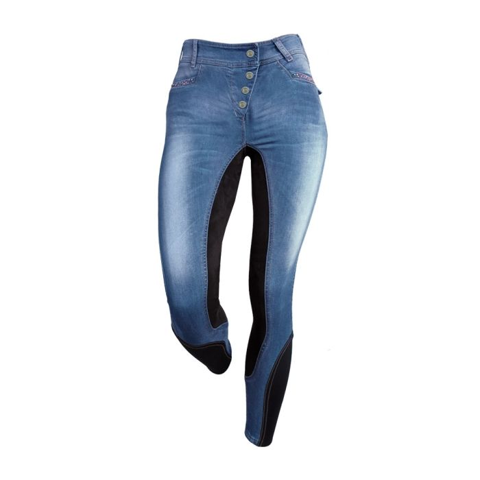 Bryczesy wykonane zostały z elastycznej tkaniny dżinsowej, która zapewnia pełną swobodę ruchów w trakcie jazdy. Materiał dopasowuje się do sylwetki, nie powodując dyskomfortu ani ucisku. To rozwiązanie doskonale sprawdza się zarówno w siodle, jak i poza nim. Elastyczne bryczesy do jazdy konnej to gwarancja wygody.