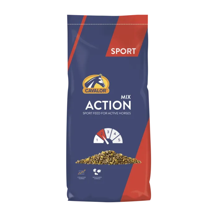 Cavalor® Action Mix to kompletna, zbilansowana pasza musli dla koni sportowych i rekreacyjnych w regularnym treningu. Opracowana w oparciu o lekkostrawne zboża poddane obróbce termicznej, zapewnia optymalne wsparcie energetyczne bez obciążania układu pokarmowego. Pasza wspiera wydolność, regenerację oraz zachowanie zdrowej flory jelitowej.