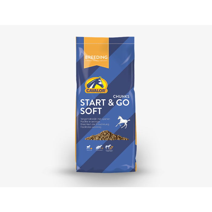 Cavalor Start & Go Soft jest wysoce przyswajalne, łatwo strawne (ekstrudowane) i smaczne dla płynnego przejścia po zakończeniu okresu karmienia mlekiem klaczy. Wysoka zawartość białka (16%) zapewnia zrównoważoną energię. Ponadto wysoka zawartość minerałów i pierwiastków śladowych takich jak: wapń, fosfor i magnez (dla rozwoju kości) oraz miedź, cynk i mangan (dla rozwoju chrząstek i stawów).