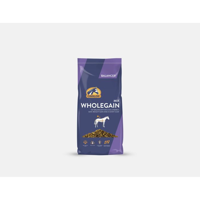 Cavalor WholeGain jest wysokotłuszczową, skoncentrowaną mieszanką paszową, która nadaje koniom sportowym lśniącą sierść i bezpiecznie stymuluje przyrost masy ciała. Cavalor WholeGain jest balanserem, który większa ilość tłuszczu w diecie konia i dostarcza ważnych składników odżywczych dla koni sportowych, w tym witamin z grupy B i minerałów.