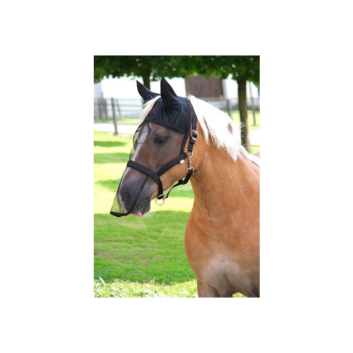 Kantar marki KERBL ze zintegrowaną maską chroniącą przed muchami. Nie ma możliwości zsunięcia się lub zgubienia przez kantar. Z ochroną uszu i chrapów. Drobnooczkowa, lekka i stabilna tkanina siatkowa. Podwójnie szyta, miękka i przyjazna dla skóry tkanina. Z polarową wyściółką zapobiegającą otarciom. Łatwe otwieranie podgardla. Płynna regulacja nagłówka i nachrapnika.