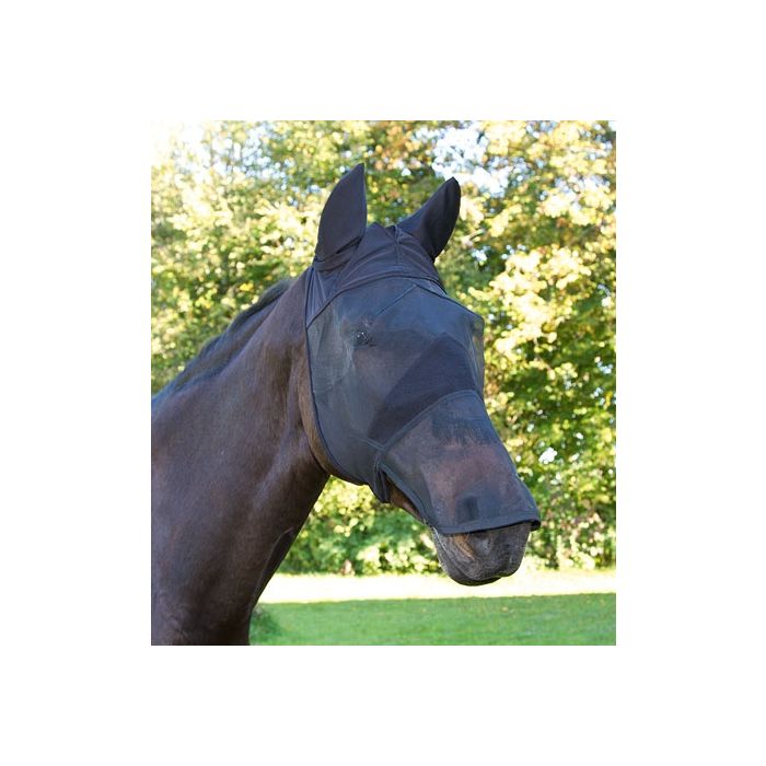 Maska przed owadami z ochroną uszu i chrap. Zintegrowana bariera przeciwko muchom pomiędzy chrapami i oczami. Okolice uszu i kości nosowej z elastycznej i przyjemnie miękkiej tkaniny. Z polarową wyściółką zapobiegającą otarciom. Bezproblemowe mocowanie na głowie konia przy pomocy zapięcia na rzep.