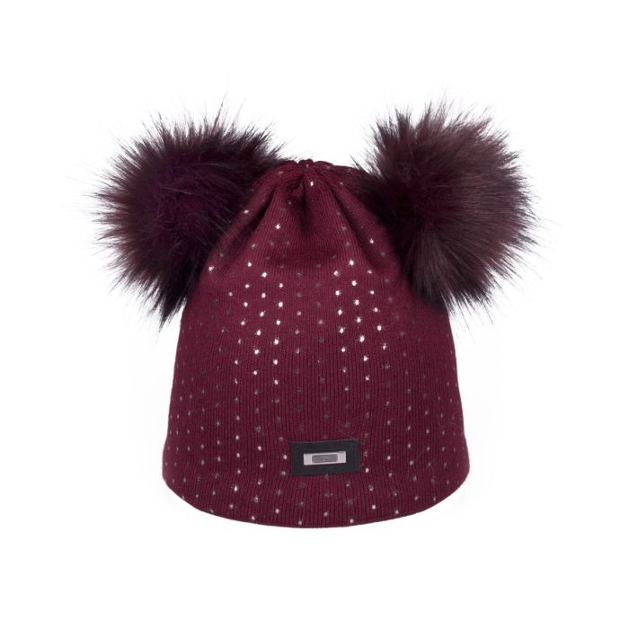 Zimowa czapka z pomponami. Podszyta polarem. Wykończona lśniącymi kropeczkami.