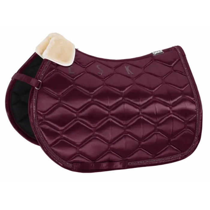 Pokryty z zewnątrz połyskującym, śliskim materiałem  Na kłębie podszycie w postaci sztucznego futerka które można odpiąć  Tłoczone literki "E S K" wykonane z silikonu zapobiegają przesuwaniu się siodła  Od spodu podszyty szybkoschnącym materiałem  Paski na rzep do przystuł z możliwością całkowitego odpięcia  Obszyty dookoła ozdobnym, lureksowym sznureczkiem oraz kryształkami