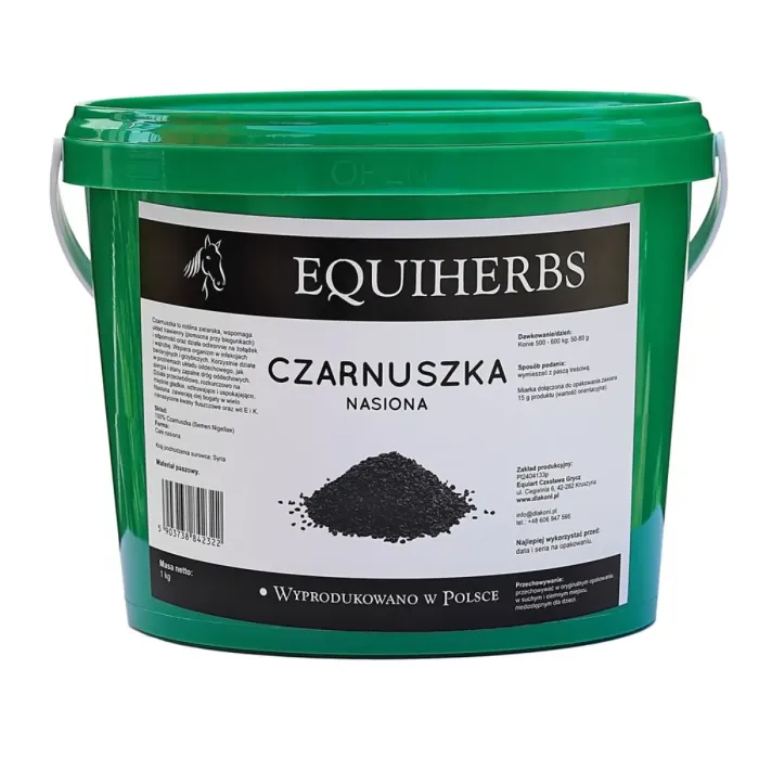 Czarnuszka Equiherbs 1kg to naturalny dodatek żywieniowy, który stanowi cenne uzupełnienie codziennej diety konia. Zawiera 100% całych nasion czarnuszki (Semen Nigellae), bogatych w kwasy tłuszczowe omega-3 i omega-6, witaminy E i K oraz związki o działaniu przeciwzapalnym i przeciwutleniającym. Regularne podawanie może przynieść korzyści w zakresie funkcjonowania układu pokarmowego, odpornościowego oraz oddechowego. Czarnuszka jest także znana ze swojego działania wspomagającego regenerację skóry i sierści oraz łagodzącego napięcia mięśniowe. Zalecana dawka dla konia o masie 500–600 kg to 50–80 g dziennie, wymieszane z paszą treściwą. To propozycja dla właścicieli koni szukających naturalnego i prostego sposobu na wsparcie zdrowia wierzchowca.