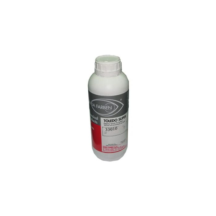 TOLEDO SUPER - płynna jednoskładnikowa farba do skór licowych . Jest transparentnym barwnikiem na bazie rozpuszczalnika o wysokiej odporności na temperaturę. Maluje skórę, zachowując jej naturalną miękkość. Nie wymaga dodatkowego przetwarzania. Nakładanie: przez natryskiwanie, bezpośrednie nanoszenie pędzlem lub wacikiem. Opakowanie: butelka plastikowa - 1L . Producent: Włochy.