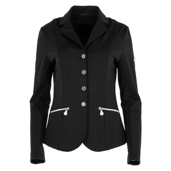 Marynarka konkursowa Samantha Covalliero to połączenie elegancji, funkcjonalności i nowoczesnych technologii materiałowych. Wykonana z wysokiej jakości, elastycznego materiału, gwarantuje pełną swobodę ruchów w trakcie jazdy. Tkanina jest wodoszczelna i oddychająca (1000 g/m²), co sprawia, że sprawdzi się nawet w trudnych warunkach pogodowych. Krótki, sportowy krój z wcięciem w talii doskonale modeluje sylwetkę, a ozdobne guziki i herb Covalliero podkreślają konkursowy charakter marynarki. Model ten wyposażono również w dwie praktyczne kieszonki na zamek, co zwiększa jego użyteczność. Samantha to wybór dla zawodniczek, które chcą prezentować się profesjonalnie, nie rezygnując przy tym z komfortu.