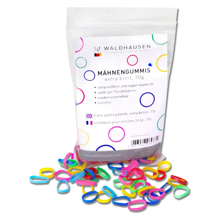 Gumki do grzywy wielokolorowe Waldhausen to praktyczny i atrakcyjny dodatek do codziennej pielęgnacji grzywy konia. Wykonane z wysokiej jakości materiału TPU, są wyjątkowo miękkie dla dłoni i delikatne dla końskiej grzywy, co znacząco zmniejsza ryzyko łamania czy wyrywania włosów. Żywe, jaskrawe kolory – czerwony, żółty, różowy, niebieski i zielony – pozwalają stworzyć efektowne koreczki, które świetnie prezentują się na treningach i pokazach. Gumki są odporne na rozdarcia, co sprawia, że można ich używać wielokrotnie bez utraty elastyczności. Nie zawierają lateksu, dzięki czemu są bezpieczne dla wrażliwej skóry konia i osób o skłonnościach alergicznych. To gumki do zaplatania grzywy, które łączą w sobie wytrzymałość, komfort i estetykę. Idealne rozwiązanie dla jeźdźców, którzy chcą w prosty sposób zadbać o schludny i kolorowy wygląd grzywy swojego wierzchowca.