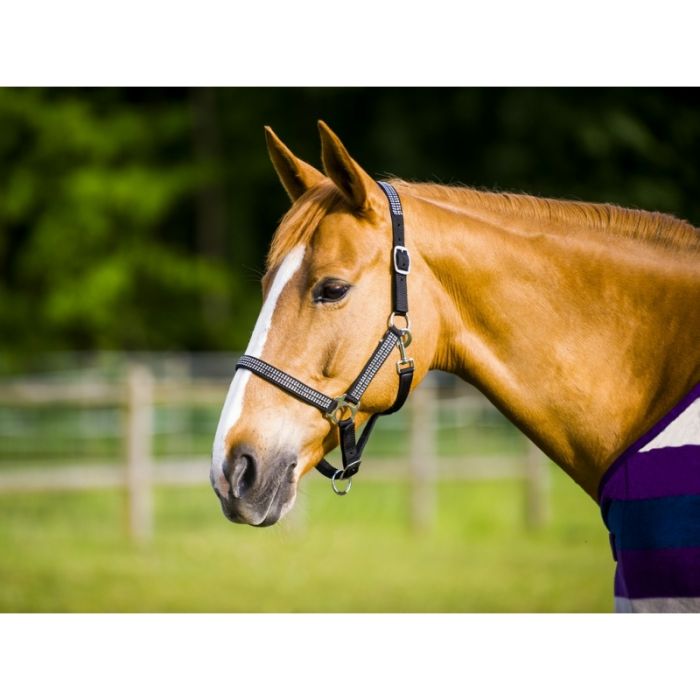 Z polipropylenu o podwójnej grubości.  Podwójna regulacja, w części potylicznej i nachrapnikowej.  Nachrapnik, części policzkowe i pasek potyliczny są ozdobione 4 inkrustowanymi rzędami przezroczystego strasu. Zatrzask na gardle z szybkim zwolnieniem. Klamry metalowe niklowane.
