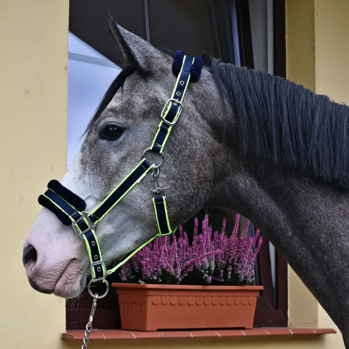 Kantar START NTF to połączenie funkcjonalności, wygody i nowoczesnego stylu, stworzone z myślą o codziennym użytkowaniu. Wykonany z wytrzymałej taśmy nylonowej, gwarantuje trwałość i odporność na przetarcia, a jednocześnie pozostaje lekki i komfortowy dla konia. Miękkie, pluszowe podszycie na nachrapniku i pasku potylicznym chroni wrażliwą skórę przed otarciami, zapewniając wygodę nawet przy długim noszeniu. Dzięki regulacji po obu stronach potylicy oraz na nachrapniku kantar można idealnie dopasować do kształtu głowy konia. Solidne, srebrne okucia oraz mocny karabińczyk zwiększają bezpieczeństwo i ułatwiają zakładanie oraz zdejmowanie. Granatowa kolorystyka z neonowozielonymi akcentami nadaje mu wyjątkowy, nowoczesny wygląd i poprawia widoczność. To kantar z futerkiem, który doskonale sprawdzi się w stajni, na padoku i w transporcie.