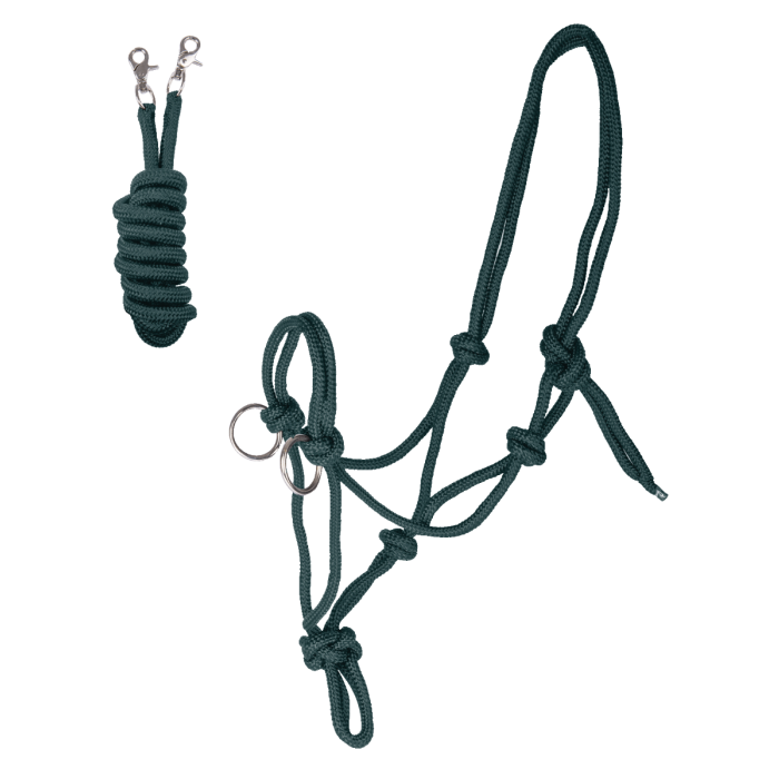 Wiązany kantar z pierścieniami.  Zamknięte wodze można zdjąć za pomocą karabińczyków zatrzaskowych.  Wszechstronny. Długość wodzy: ok. 3,15 m