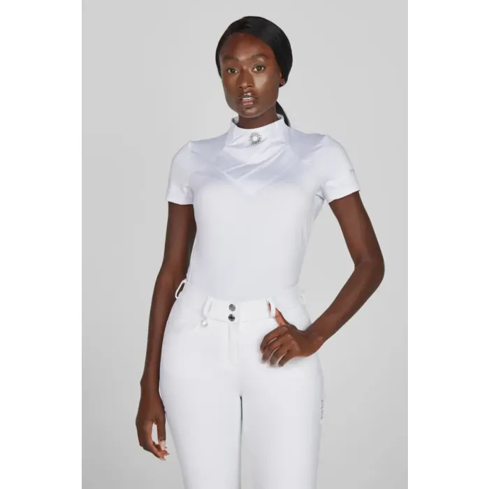 Model wyróżnia się plisowanym kołnierzem z aplikacją z kryształków, który nadaje elegancki charakter. Koszulka konkursowa jeździecka damska zyskuje dzięki temu subtelny, dekoracyjny akcent. Kołnierzyk zachowuje klasyczną formę, jednocześnie podkreślając styl jeździecki. To idealne rozwiązanie dla osób ceniących detale. Koszulka jeździecka konkursowa prezentuje się efektownie na parkurze i czworoboku. Elegancja łączy się tu z funkcjonalnością.