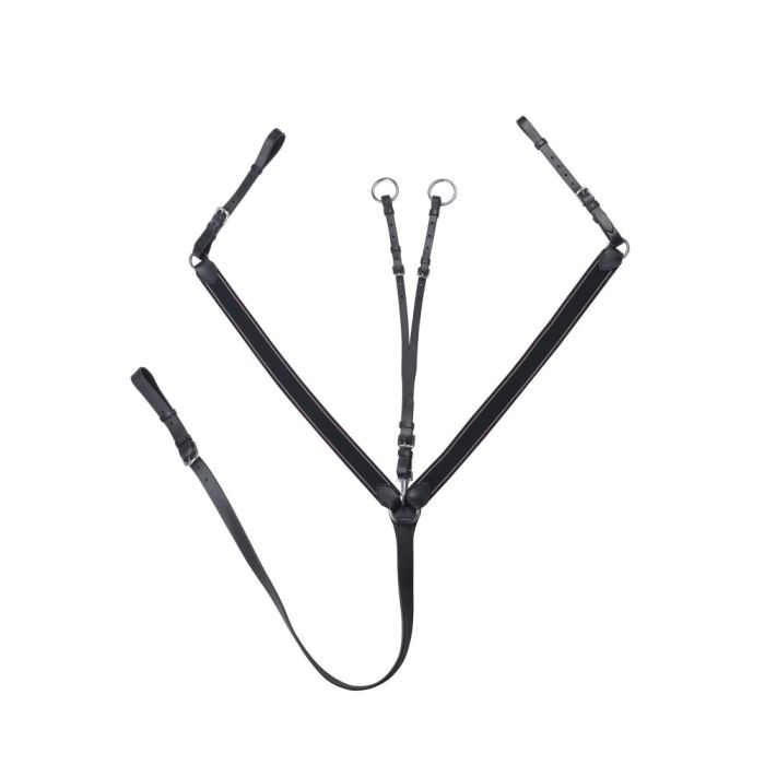 Skórzany napierśnik z regulowanym, wypinanym wytokiem. Po bokach wyposażony w solidne, szerokie gumy dla lepszego dopasowania. Zapinany na klasyczne sprzączki wykonane ze stali nierdzewnej.