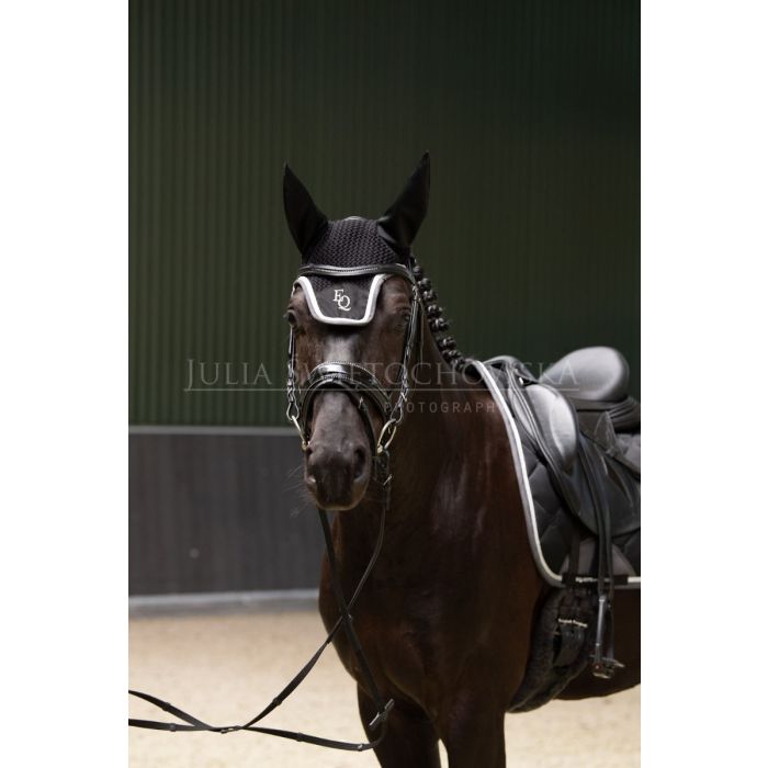 Ogłowie EQ.QUEEN Orion łączy nowoczesny design z najwyższym komfortem użytkowania. Elegancki, anatomicznie wyprofilowany nachrapnik, pokryty lakierowaną skórą, nie tylko przyciąga wzrok, ale również zapewnia wygodę dla konia, redukując nacisk i minimalizując ryzyko otarć. Dodatkowo, nachrapnik posiada na całej długości ozdobne diamenciki, które dodają mu wyjątkowego blasku i stylu. Ogłowie wyposażone jest w pięknie zdobiony naczółek z kryształkami, co dodaje całości elegancji. Całość wykonana z wysokiej jakości skóry gwarantuje trwałość i elegancki wygląd przez długi czas. Regulacja nachrapnika i paska potylicznego na obu końcach pozwala na idealne dopasowanie do kształtu głowy konia. Ogłowie EQ.QUEEN Orion to idealne połączenie funkcjonalności i stylu – doskonałe zarówno na co dzień, jak i na specjalne okazje.