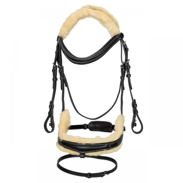 Ogłowie wykonane z wysokiej jakości skóry z anatomicznym nachrapnikiem. Zarówno nachrapnik jak i pasek potyliczny podszyte są naturalnym futerkiem. Ogłowie posiada miękko podszyty, opadający naczółek, białe przeszycia oraz wodze gumowane w komplecie.