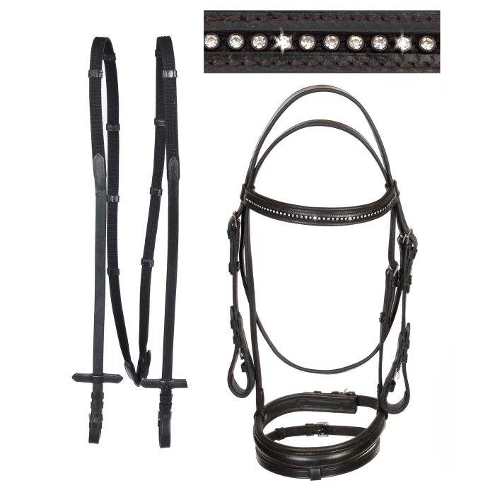 Ogłowie z nachrapnikiem angielskim kombinowanym. Wykonane z dobrej jakości skóry, miękko podszyte na nachrapniku. Wyposażone w miękko podszyty, prosty naczółek z kryształkami. Elementy metalowe wykonane ze stali nierdzewnej. W zestawie z wodzami parcianymi o szerokości 19 mm.