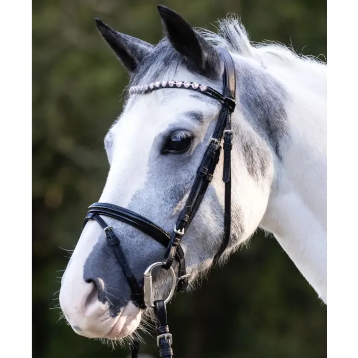 Ogłowie dla konia Waldhausen Happy Hearts posiada prosty nachrapnik typu flash, wykonany z imitacji skóry lakierowanej. Ten element dodaje całości szyku, a jednocześnie zwiększa trwałość i łatwość czyszczenia. Dla jeźdźców szukających sprzętu łączącego estetykę z praktycznością, to ogłowie dla koni będzie doskonałym wyborem.