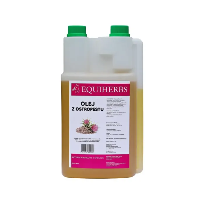 Olej z Ostropestu Equiherbs 1L to w pełni naturalny suplement diety dla koni, tłoczony na zimno, który zachowuje wszystkie najcenniejsze właściwości rośliny. Jest bogaty w nienasycone kwasy tłuszczowe oraz sylimarynę, czyli substancję znaną ze swojego wyjątkowego wpływu na zdrowie wątroby. Regularne stosowanie oleju wspiera regenerację komórek wątrobowych, chroni je przed toksynami i wspomaga odtruwanie organizmu, co ma kluczowe znaczenie u koni po terapii lekowej, zatruciu pokarmowym czy kolce. To także doskonały sposób na wsparcie koni sportowych, których organizm jest bardziej obciążony intensywnym wysiłkiem. Olej z ostropestu dla konia korzystnie wpływa również na układ pokarmowy, poprawiając procesy trawienne i wspierając wchłanianie składników odżywczych z paszy. Wykazuje też działanie antyoksydacyjne, neutralizując wolne rodniki, które odpowiadają za stres oksydacyjny i spadek wydolności. Dodatkową zaletą jest jego pozytywny wpływ na skórę, sierść i kopyta konia – nadaje sierści zdrowego blasku, wspomaga regenerację skóry i poprawia ogólną kondycję zwierzęcia. To suplement, który powinien znaleźć się w diecie każdego konia wymagającego wsparcia wątroby, odporności oraz ogólnej regeneracji organizmu.
