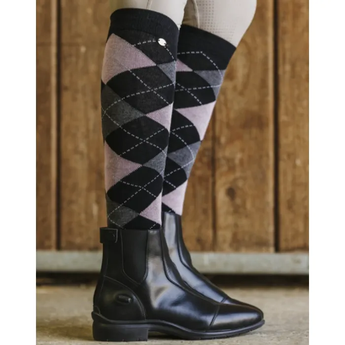 Podkolanówki jeździeckie EquiTheme Argyle łączą w sobie klasyczny styl z komfortem użytkowania, oferując idealne rozwiązanie dla osób aktywnie jeżdżących konno. Wykonane z mieszanki bawełny, poliestru i elastanu, zapewniają odpowiednią elastyczność i oddychalność, dzięki czemu dobrze sprawdzają się podczas treningów i codziennej jazdy. Wzór w kontrastujące romby nadaje im elegancki, a zarazem sportowy wygląd, który komponuje się z różnymi elementami jeździeckiego stroju. Elastyczny ściągacz na górze skarpety sprawia, że nie zsuwają się i pozostają stabilne nawet pod butami i czapsami. Dodatkowo skarpetki posiadają metalowe logo marki EquiTheme, podkreślające ich dopracowany charakter. To praktyczne i stylowe skarpety jeździeckie, które sprawdzą się w każdej stajennej szafie.