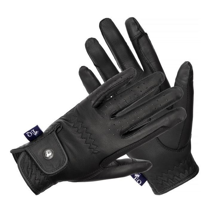 Klasyczne, czarne, skórzane rękawiczki stanowią praktyczny dodatek do każdej stylizacji! Wykonane zostały z wysokiej jakości, miękkiej skóry naturalnej, dzięki czemu są wytrzymałe i świetnie sprawdzą się na jazdach. Dodatkowo posiadają wzmocnienia w miejscu trzymania wodzy. Dziurkowany materiał na wierzchniej stronie palców zwiększa przewiewność, a elastyczny ściągacz sprawia, że świetnie dopasują się do dłoni jeźdźca. Zaopatrzone są w mocny rzep ze zdobieniem w postaci logo Equestrian Queen. Pozwalają na korzystanie z ekranu dotykowego telefonu w czasie noszenia. 100% Skóra naturalna. Nie prać w pralce, nie suszyć w suszarce bębnowej, nie prasować.