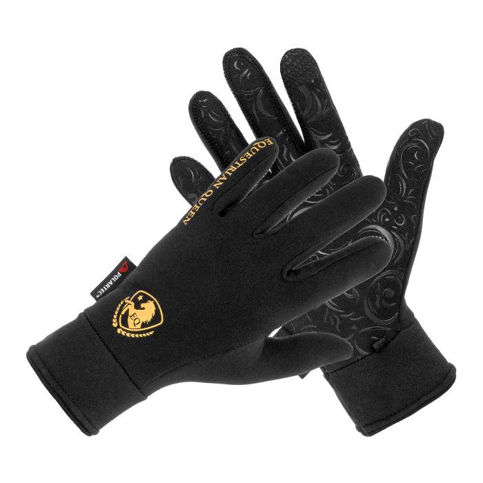 Rękawiczki zimowe wykonane z materiału Polartec. Świetnie trzymają ciepło, są oddychające i rozciągliwe. Błyskawicznie odprowadzają wilgoć, są odporne na ścieranie i zachowują swój kształt. Zdobione złotymi printami. Cała wewnętrzna strona dłoni pokryta silikonowym gripem aby ułatwić trzymanie wodzy. Idealny wybór na zimowe treningi. 52% poliester, 39% nylon, 9% spandex