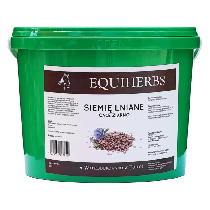 Siemię lniane Equiherbs 2kg to naturalny suplement diety dla koni, który stanowi doskonałe źródło błonnika, kwasów tłuszczowych Omega-3, minerałów i przeciwutleniaczy. Regularne stosowanie wspiera trawienie, poprawia kondycję sierści i skóry, a także wzmacnia odporność organizmu. Zawarte w siemieniu substancje śluzowe mają działanie osłaniające błonę śluzową przewodu pokarmowego, co jest szczególnie korzystne dla koni z wrażliwym układem trawiennym. Dzięki wysokiej zawartości kwasu α-linolenowego siemię korzystnie wpływa na strukturę skóry, połysk sierści oraz wzrost kopyt. To produkt o szerokim zastosowaniu – idealny zarówno dla koni sportowych, jak i rekreacyjnych, młodych i starszych. Siemię lniane można podawać w formie mielonej lub zalanej ciepłą wodą, co ułatwia przyswajanie składników odżywczych. Siemię lniane w diecie konia wspiera naturalną odporność, witalność i ogólną kondycję, będąc nieodzownym elementem zdrowego żywienia.