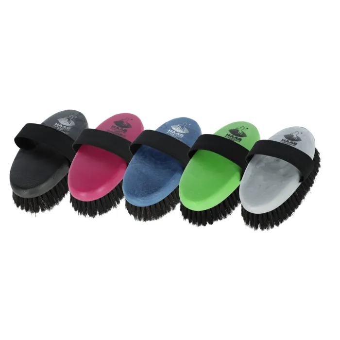 Szczotka dla konia do gładzenia sierści Haas to praktyczne akcesorium pielęgnacyjne, które łączy delikatność włosia z ergonomicznym kształtem. Dzięki miękkiej strukturze doskonale nadaje się do wygładzania sierści, nadając jej jedwabisty połysk bez podrażnień. Jej elastyczna szlufka na rękę zapewnia wygodny i stabilny chwyt, co ułatwia czyszczenie również w trudniej dostępnych miejscach. Szczotka dostępna jest w żywych, atrakcyjnych kolorach, które wyróżniają ją na tle klasycznych akcesoriów stajennych. Produkt sprawdzi się zarówno podczas codziennej pielęgnacji, jak i przygotowania konia do zawodów.