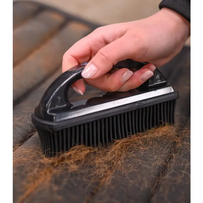 Zastosowane gumowe włosie skutecznie przyciąga i zbiera nawet uporczywą sierść z różnych powierzchni. Szczotka do usuwania sierści działa efektywnie na czaprakach, derkach oraz odzieży jeździeckiej. Elastyczna struktura włosia pozwala dokładnie oczyścić materiał bez ryzyka jego uszkodzenia. Dzięki temu szczotka do sierści nadaje się do regularnego użytkowania. To praktyczne rozwiązanie dla osób dbających o czystość sprzętu i tekstyliów.