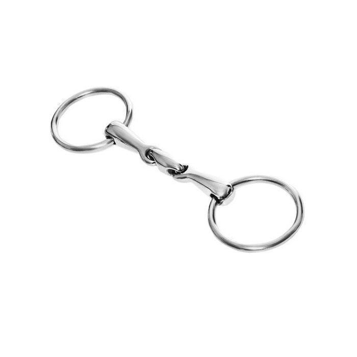 Podwójnie łamane wędzidło ze stali nierdzewnej z anatomicznym łącznikiem. Dedykowane dla kucy. Grubość 14 mm, średnica kółek 55mm