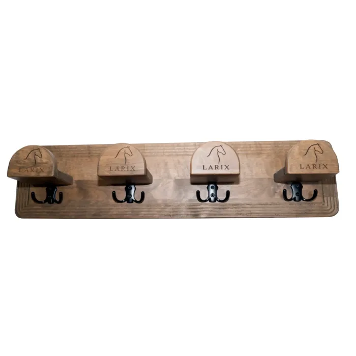 Wieszak na ogłowia Larix to solidne i eleganckie akcesorium, które ułatwia utrzymanie porządku w każdej stajni. Wykonany z trwałego drewna liściastego, wyróżnia się wysoką estetyką i odpornością na intensywne użytkowanie. Dzięki przemyślanej konstrukcji pomieści 4 ogłowia i/lub kantary, a dodatkowe haczyki umożliwiają zawieszenie innych akcesoriów. Dwa mocne haki pozwalają na łatwe przenoszenie wieszaka lub przykręcenie go na stałe do ściany, co zapewnia uniwersalność zastosowania. To produkt polskiej marki, która stawia na jakość i staranność wykonania. Ozdobiony logotypem Larix, może być również spersonalizowany – w miejscu logo producenta istnieje możliwość umieszczenia własnego. To praktyczne rozwiązanie, które łączy funkcjonalność, trwałość i estetykę.