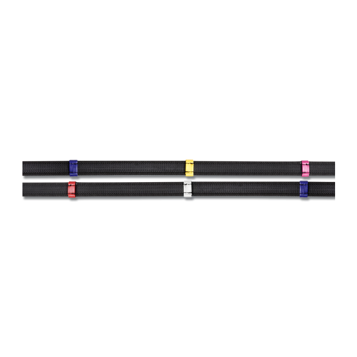 Ze zintegrowaną gumową powłoką.  Z paskami w różnych kolorach dla uproszczonej korekty rozmiaru wodzy. Wodze z wysokiej jakości skóry, doskonale wykonane. Z klamrami ze stali nierdzewnej. Szerokość PONY: 16 mm, Szerokość FULL: 19 mm