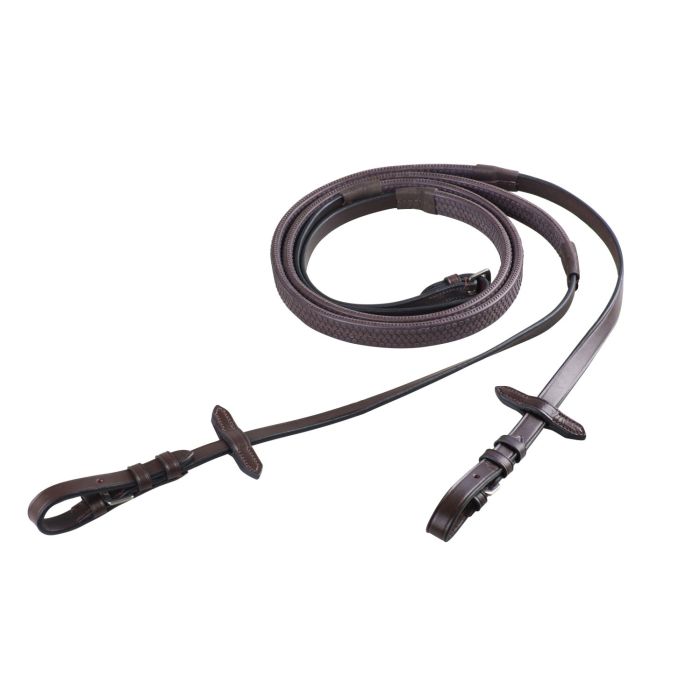 Wytrzymałe gumowe wodze z zapewniającym stabilny chwyt wzorem antypoślizgowym. Zapinane na klasyczne sprzączki. Posiadają motylki do wytoku. Szerokość: 22 mm.